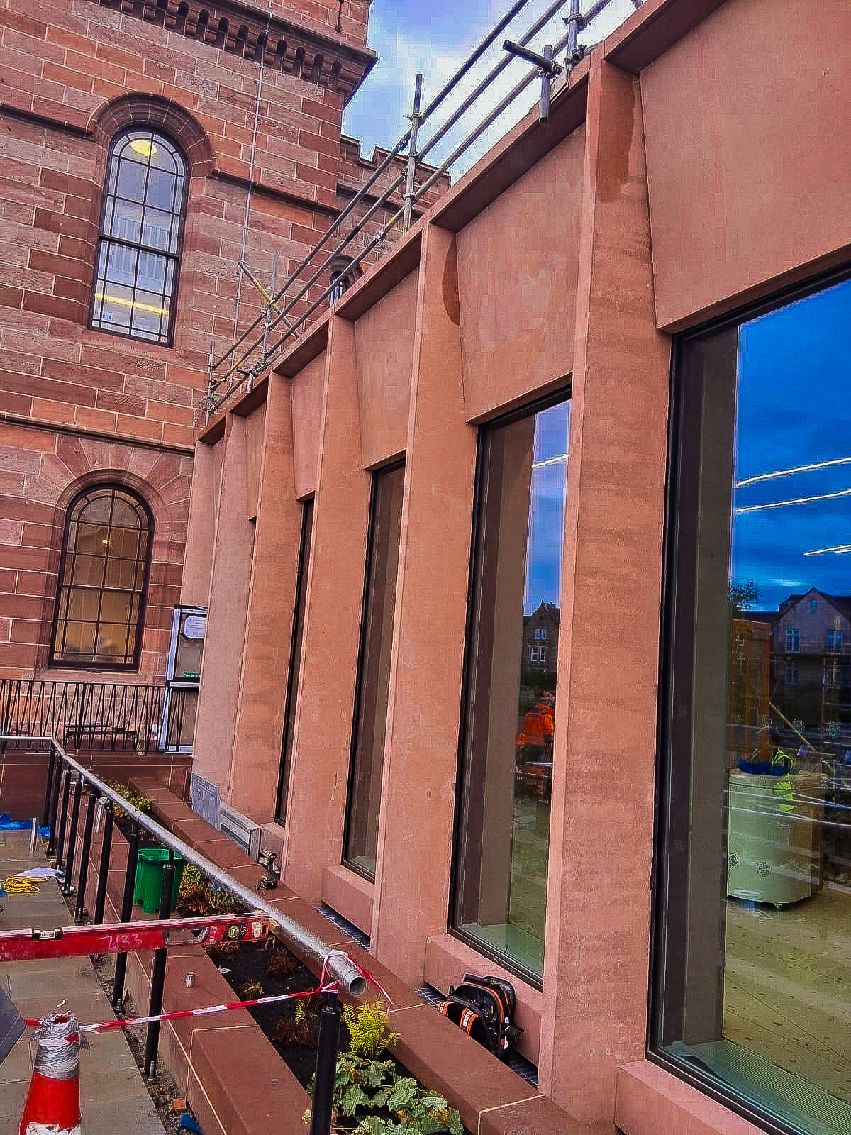 To recreate the distinctive warmth and grain of the original stone, Creagh carried out extensive in-house trials, testing a variety of natural materials and colour mixes. The final blend used red granite from Creagh’s quarry, combined with white cement and red pigment. Using materials from their own quarry helped keep the look consistent.